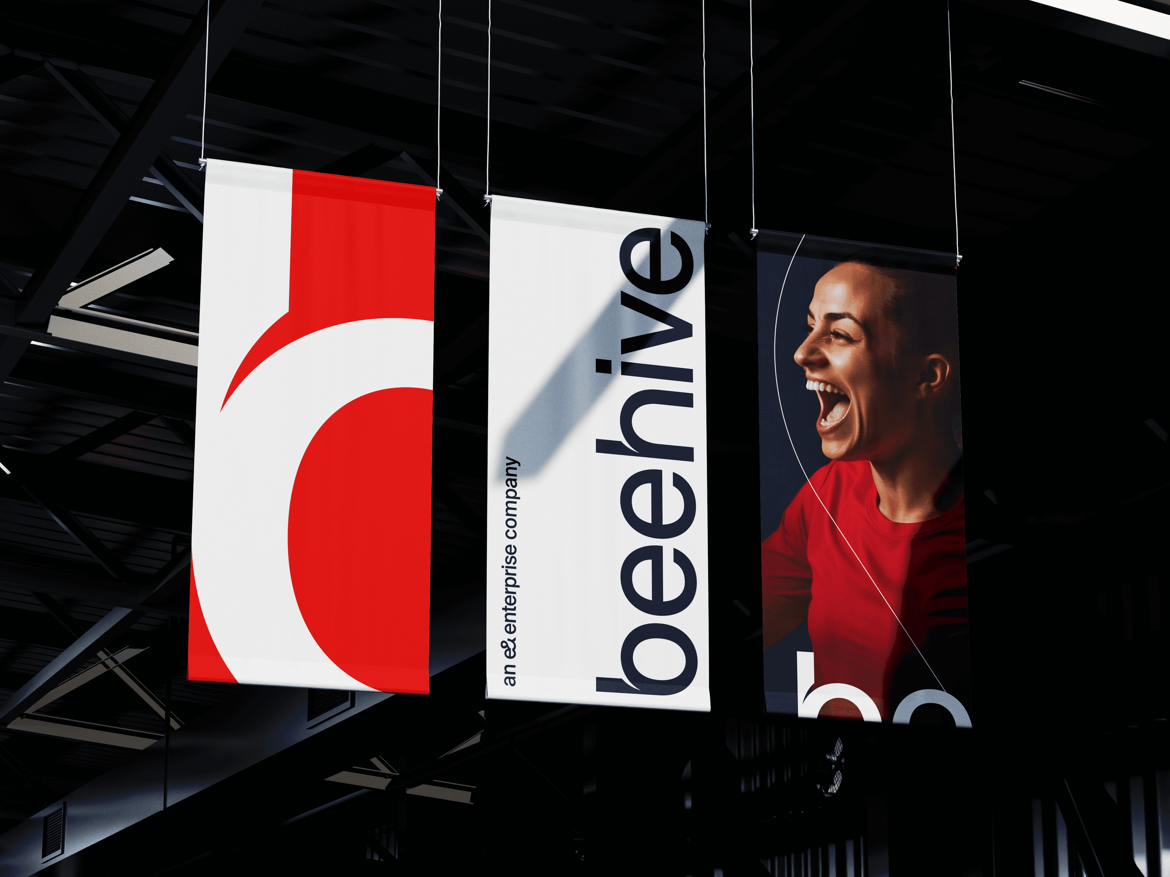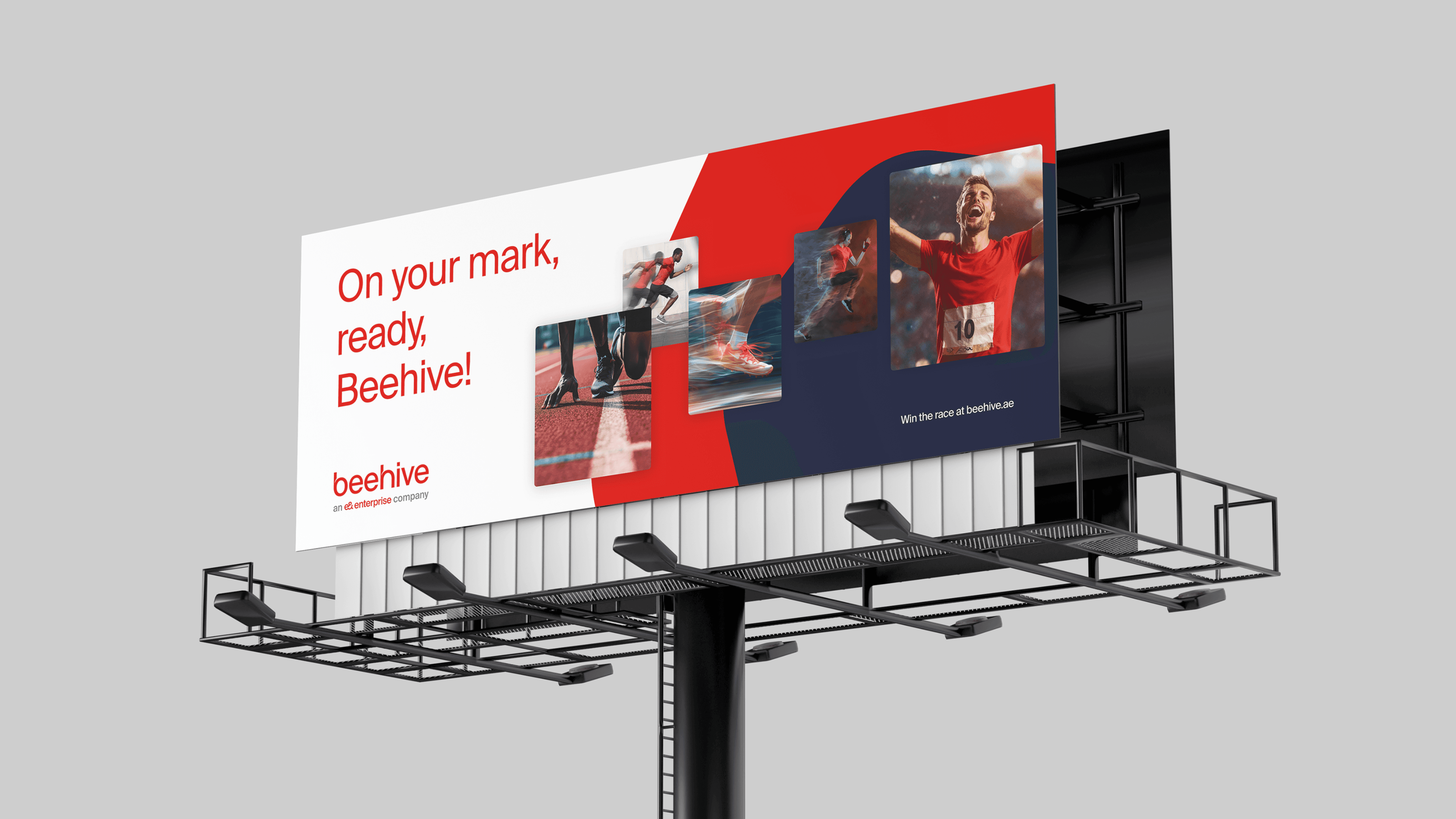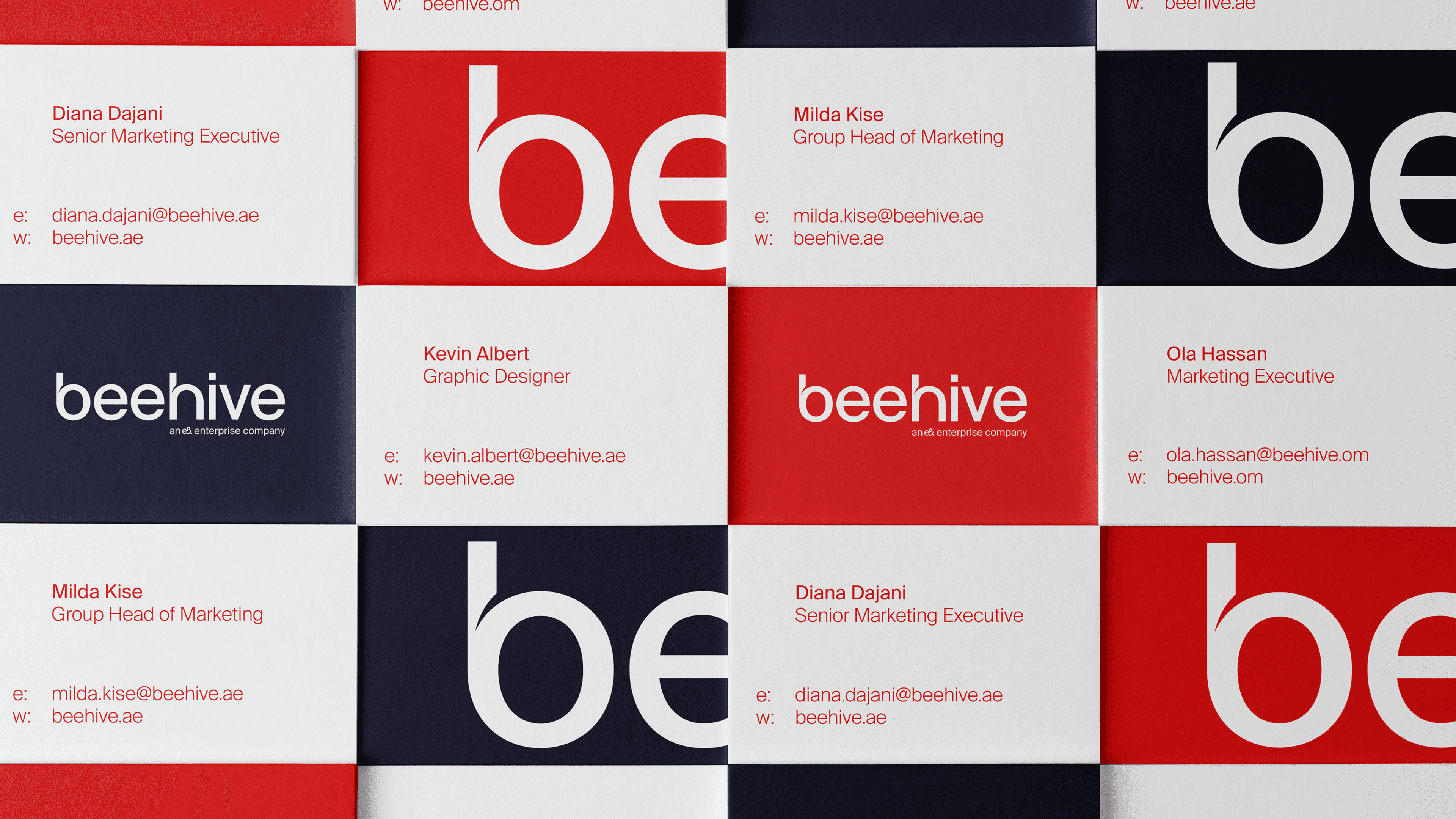 Operating on the fine line between a full brand redesign and a brand evolution, we chose to introduce a significant refresh while retaining key recognisable elements. This gave Beehive a sense of continuity and 'onward motion' rather than a disruptive shift. We fully redesigned the logo to reflect the company’s momentum and its stronger position in the industry, while keeping the distinctive red and the Suisse Int’l typography as a bridge between Beehive and the broader e& brand family. By updating the colour palette and expanding the graphical system, we elevated the brand into a more mature, confident and premium territory. The new system provides a richer and more versatile visual language that scales across platforms and supports Beehive’s expansion from the UAE into Oman and Saudi Arabia.